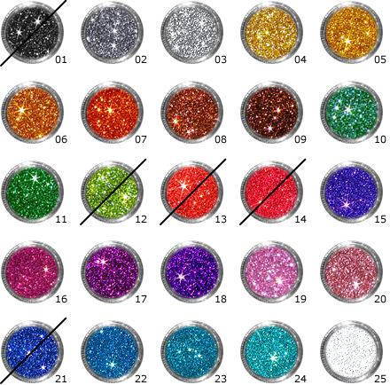 Bedenke bitte, dass die Glitzerfarben durch deine Monitoreinstellung abweichend ausfallen können, d.h. bei dir zu Hause also farblich möglicherweise anders aussehen.
